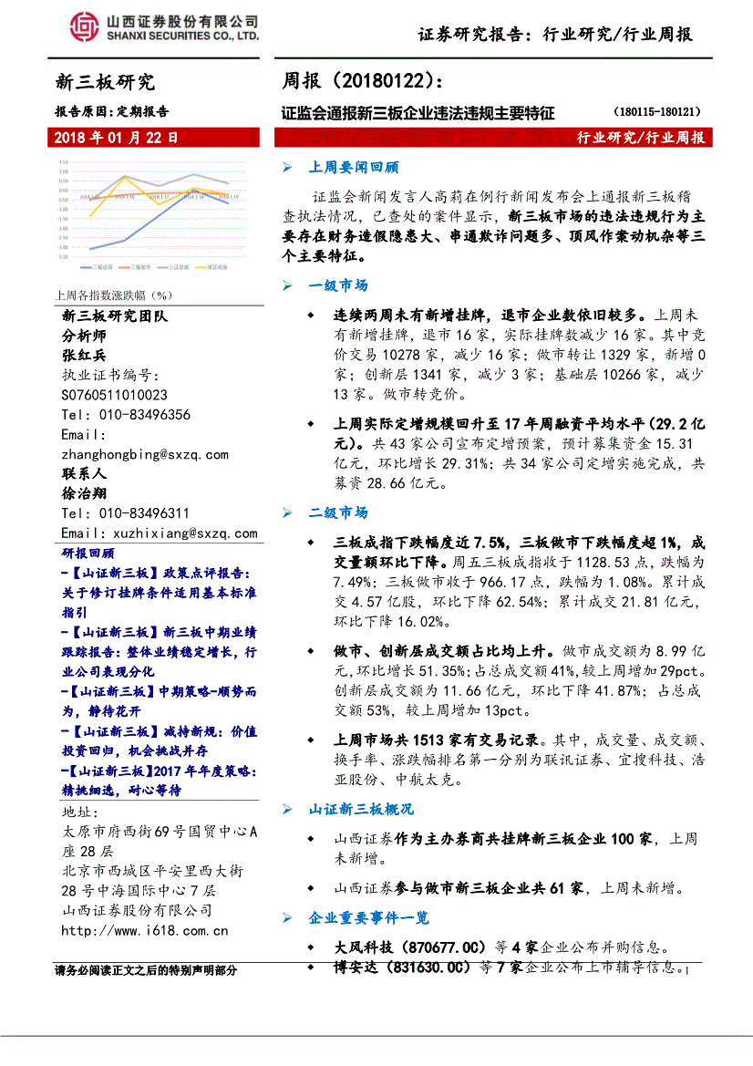 1 证券研究报告:行业研究/行业周报新三板研究周报(20180122):证监会通报新三板企业违法违规主要特征报告原因:定期报告(18) 2018年01月22日 行业研究/行业周报上周各指数涨跌幅(%) 上周要闻回顾证监会新闻发言人高莉在例行新闻发布会上通报新三板稽查执法情况,已查处的案件显示,新三板市场的违法违规行为主要存在财务造假隐患大、串通欺诈问题多、顶风作案动机杂等三个主要特征。